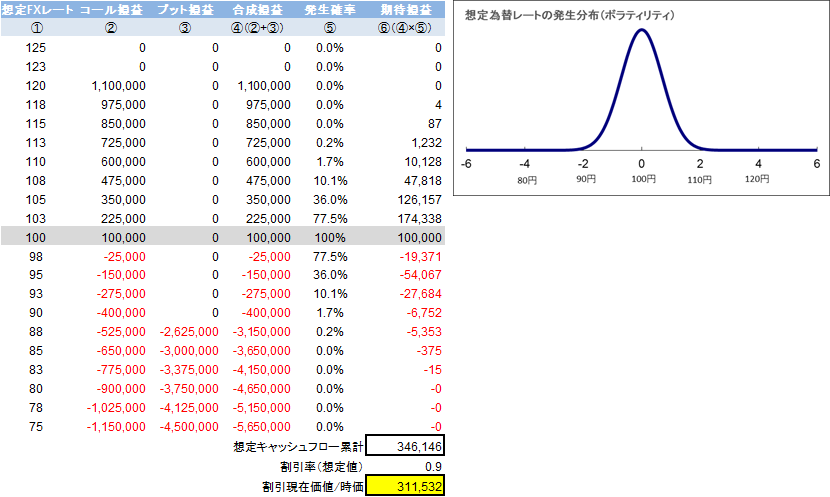 そこで、上記ケースを基にした簡単な価値評価の考え方を説明することにします(ただし、金融工学的説明はせず簡略化した財務モデルにとどめます)。かなり大雑把にいいますと、「決済時に想定される為替レートに応じた想定損益の合計額」を現在価値に引き直したものとなります。換言すると、前述したペイオフ曲線にて求められる損益を為替レートの実現度合い(=発生確率)に従い加重平均したものになりますが、下記①および②においてその違いを説明することにします。