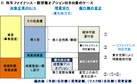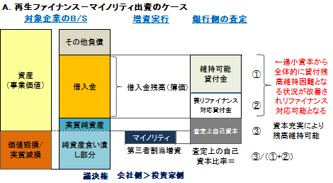 ![]() 本業価値が十分ある(あるいは信用補完での回復見込が高い)ケースにおける条件設定の基本観は、自己資本の目減りを補填し、リファイナンス要件を満たす程度のマイノリティ出資を指向することです。 価値毀損が軽少である限り、銀行側の融資姿勢もリファイナンス部分の調整にとどまるため、銀行側の査定に不足する資本の充足のみで足りる状況といえます。 |